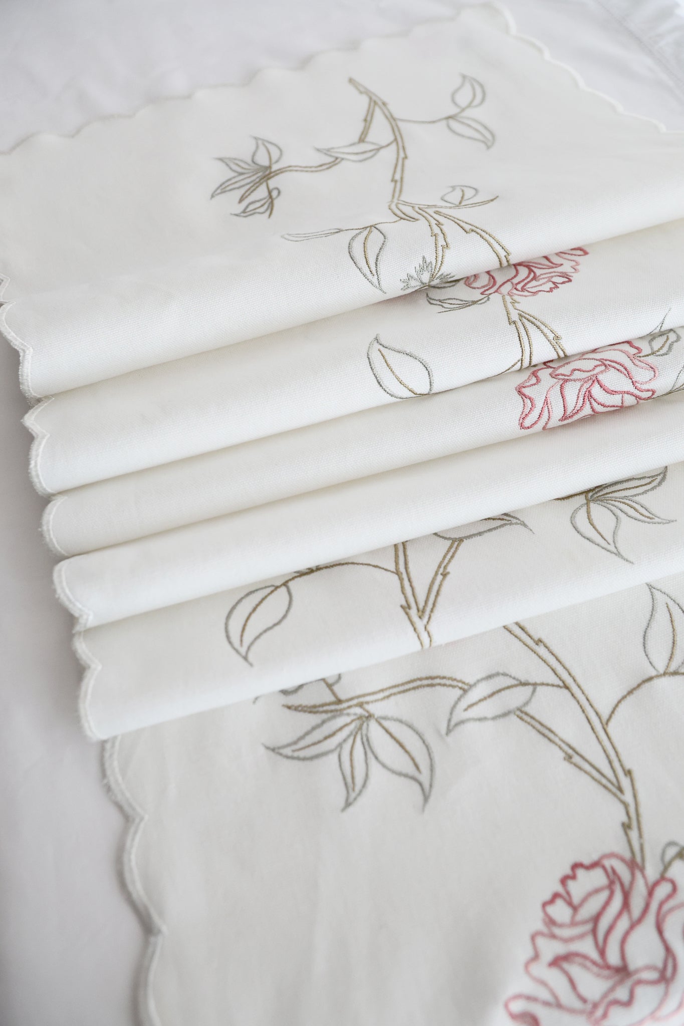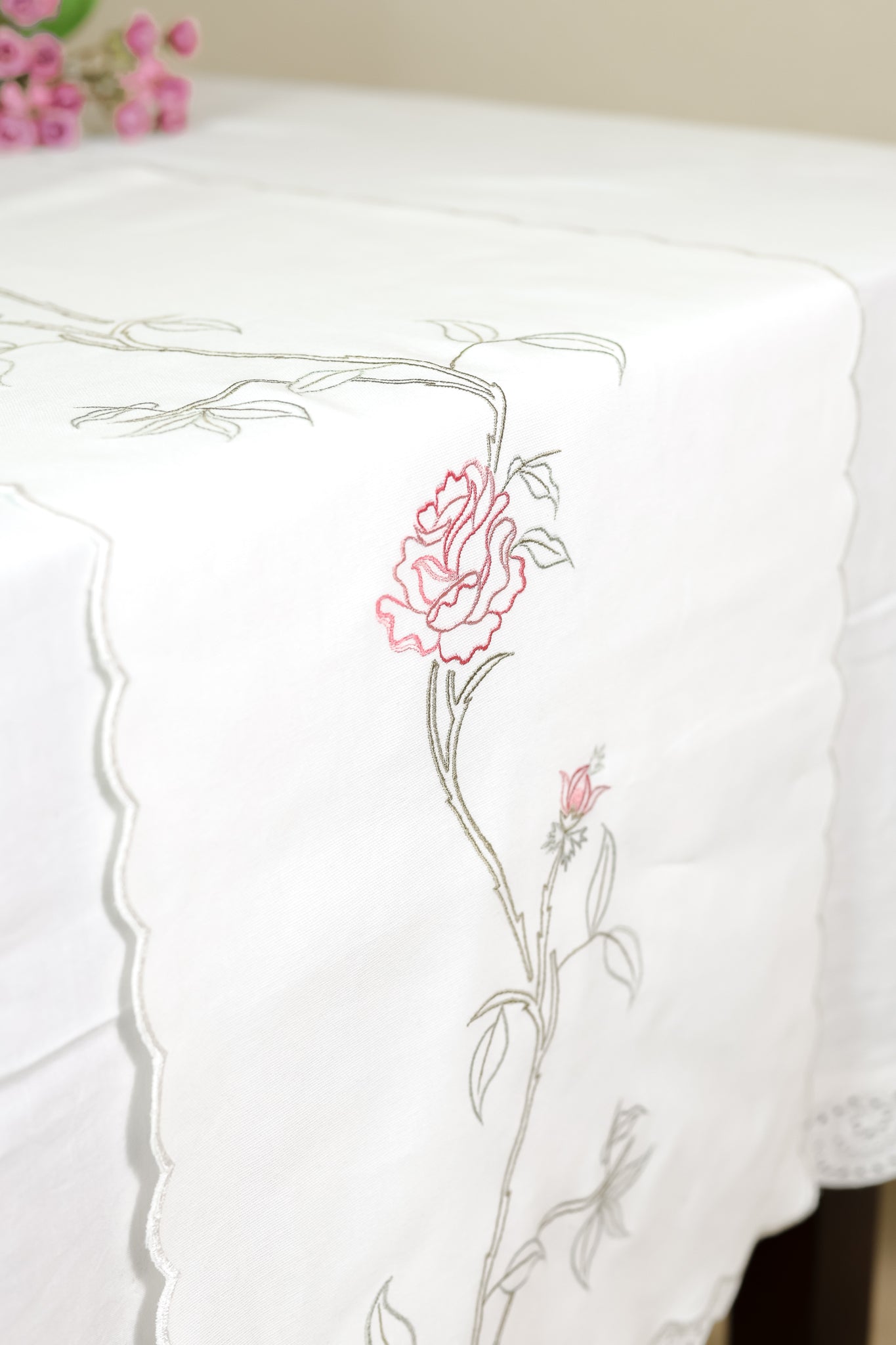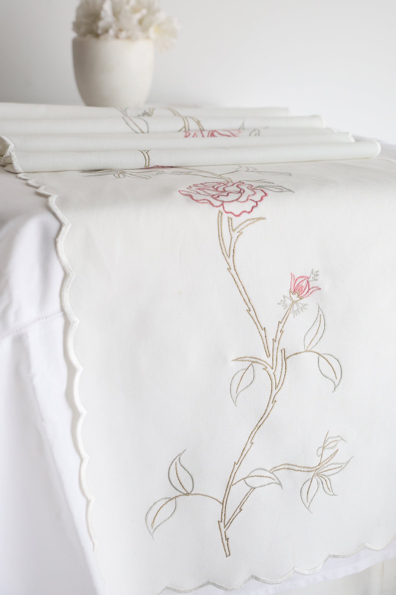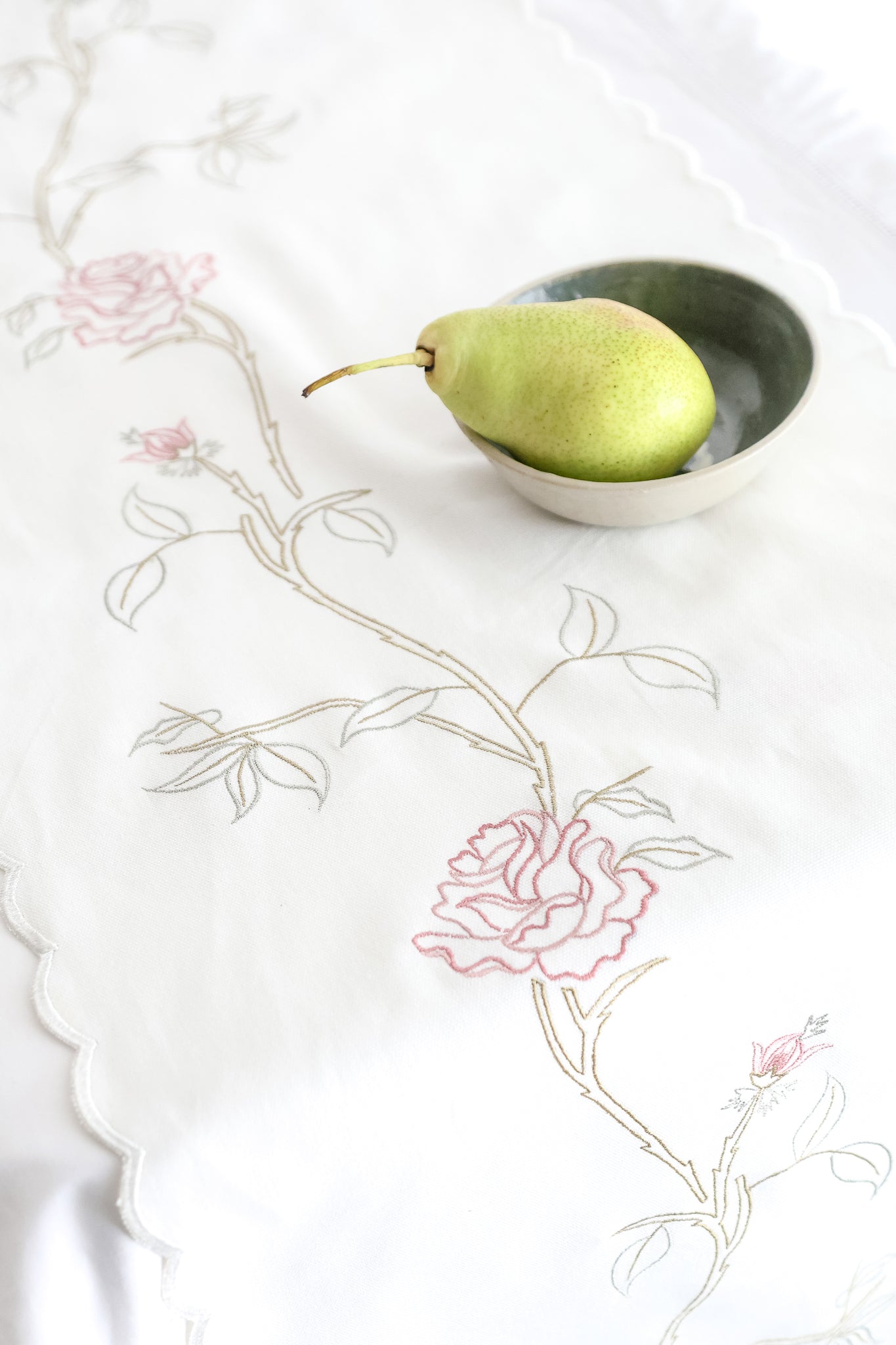 English Rose embroidered table runner in white. Adorned with delicate roses, this charming addition brings a touch of traditional elegance to any table setting.