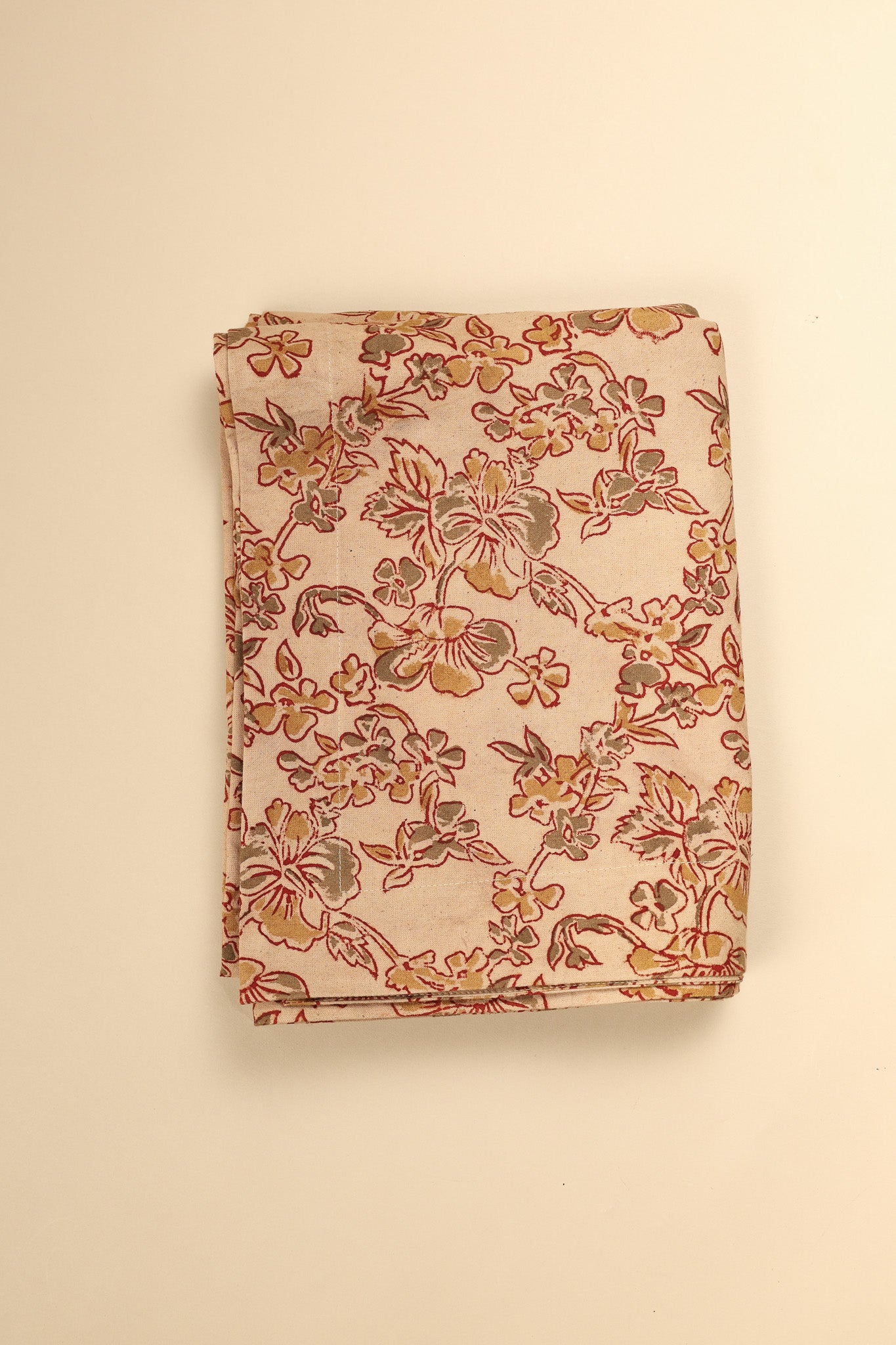 Elevate your dining experience with our exquisite Kalamkari Hand Block Table Cloth. Featuring a beautiful floral pattern in shades go green and red on a beige base, this table cloth brings a touch of warmth and artisanal charm to any table space.