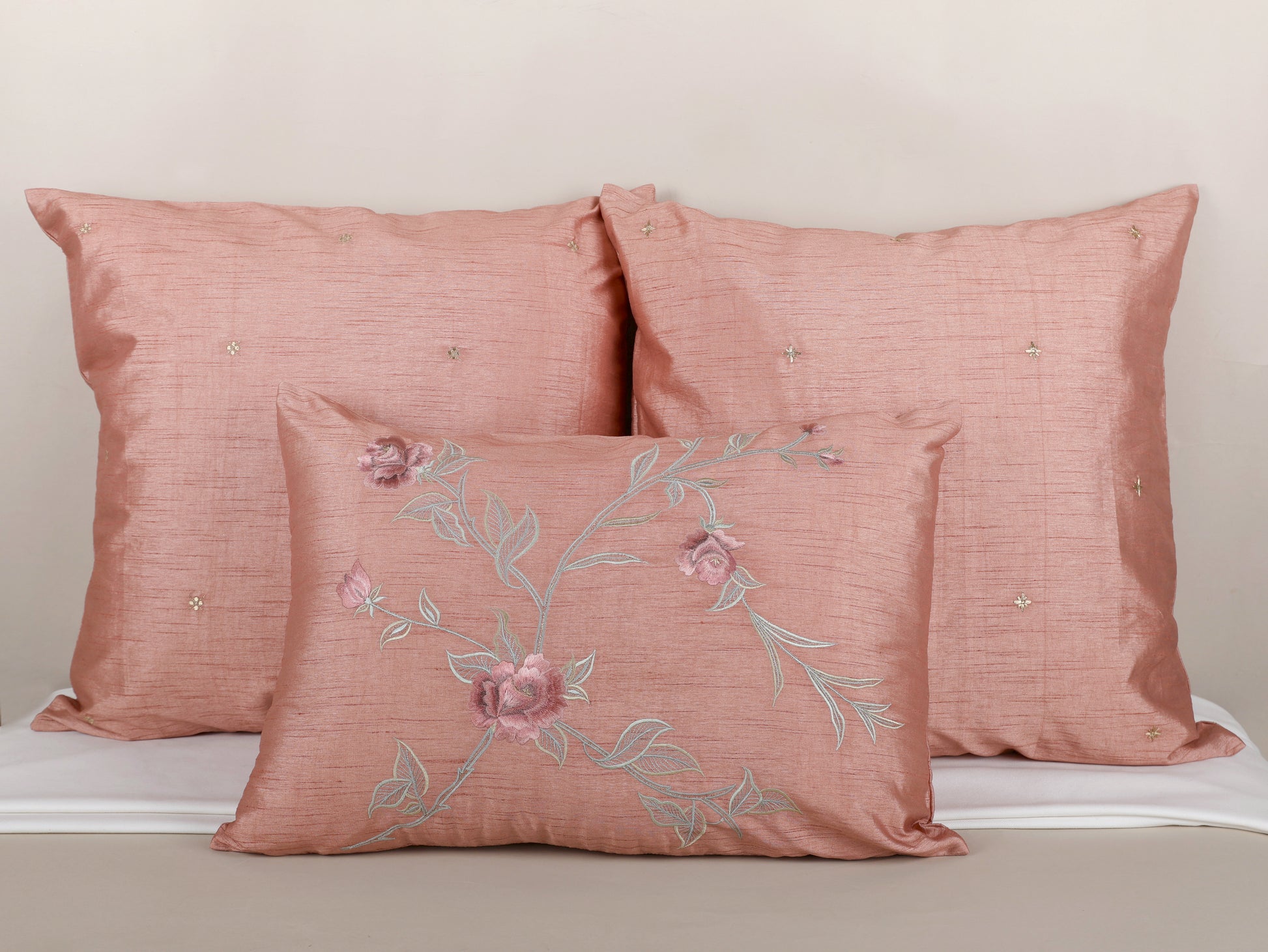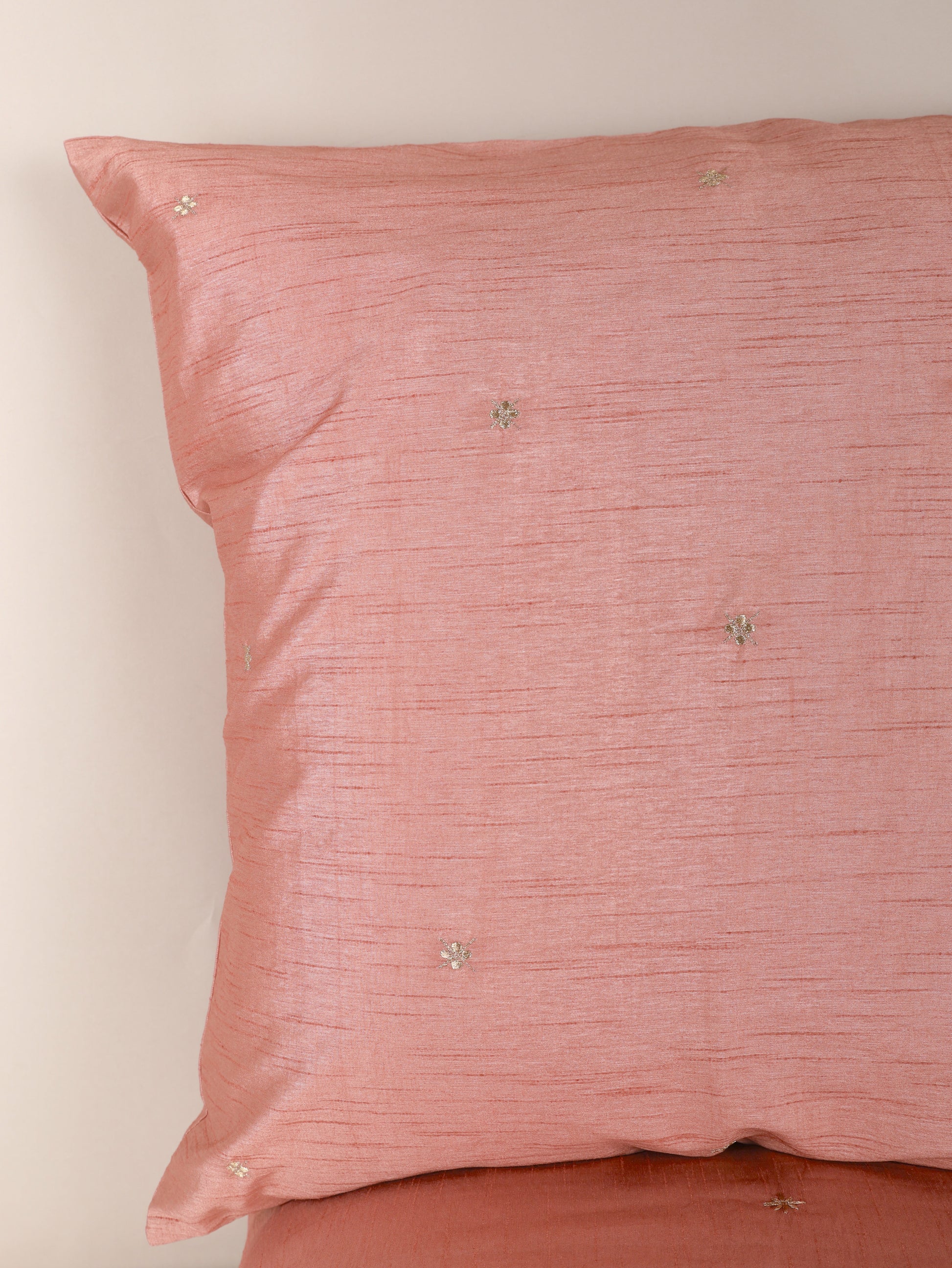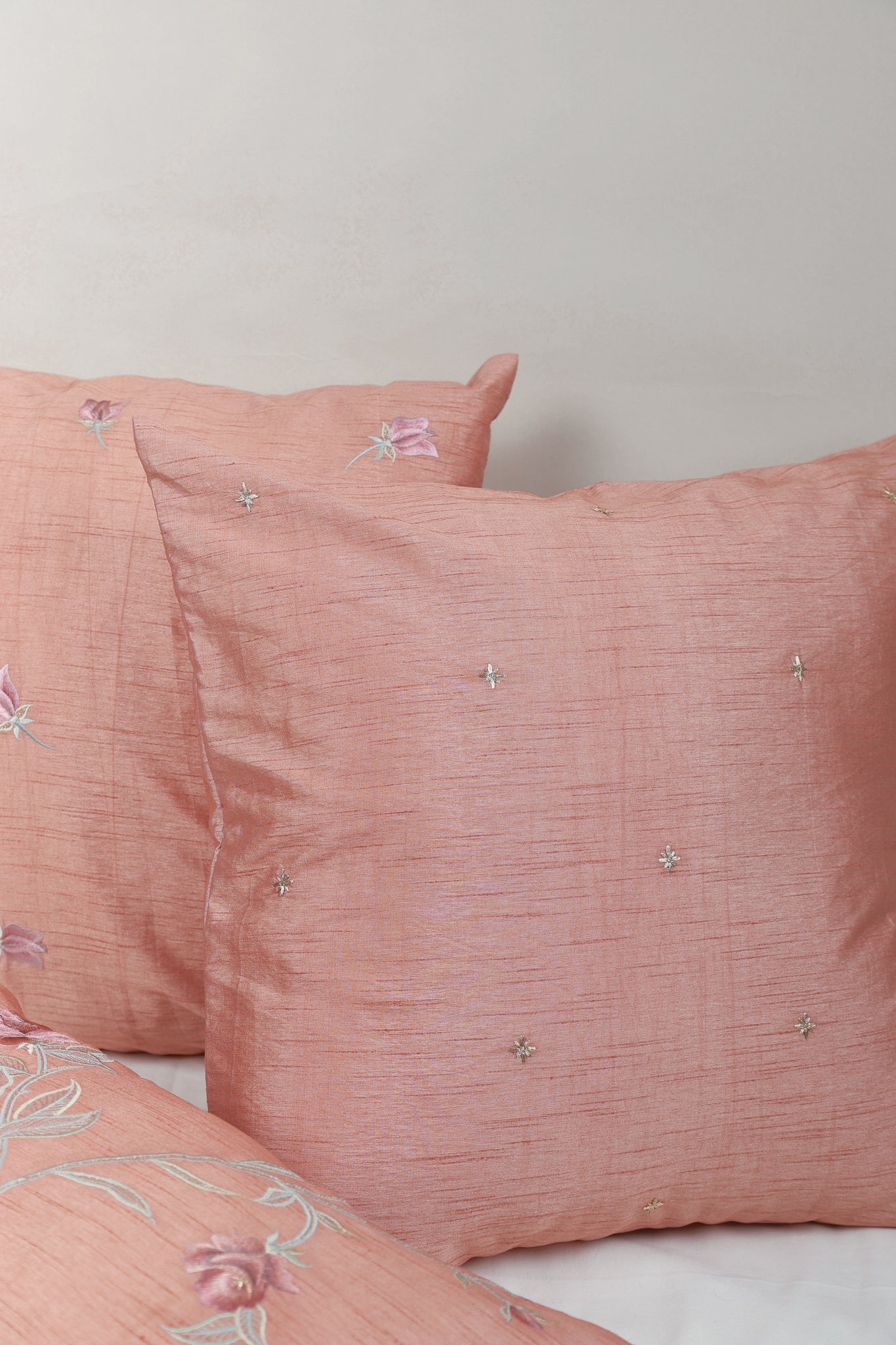 Blush-coloured silk pillow cover, delicately embroidered with tiny gold motifs. Elevate your space with the subtle infusion of soft hues, creating a graceful ambiance that exudes charm and sophistication.